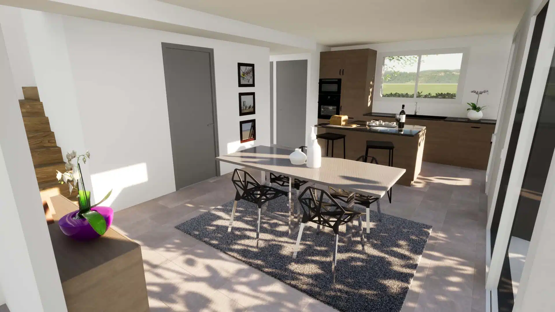 – d’une pièce à vivre avec cuisine ouverte et salon en décroché